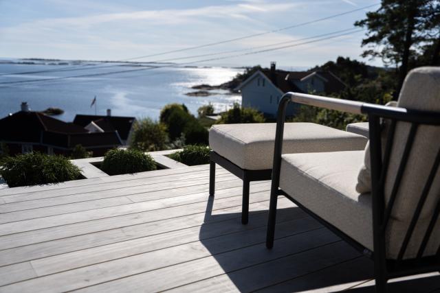 Frisk høstluft med et hint av sjø er det som møter oss i det vi parkerer bilen og går opp stien mot hytta på Stathelle. Solen varmer og bak oss ligger sjøen blikkstille og glitrer i septembersola. I det vi runder hjørnet møter vi en helt spesiell uteplass, kledd i Accoya fra topp til tå: