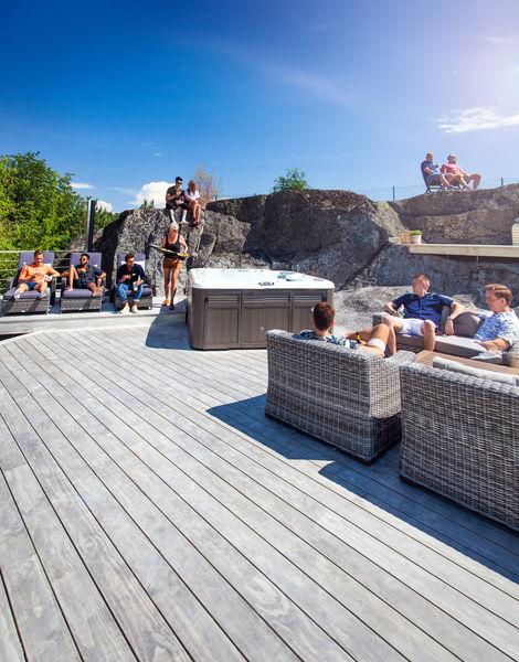 Accoya terrasse er fremstilt av acetylert Radiata-furu fra sertifiserte kilder. Modifiseringen gir uovertruffen stabilitet og holdbarhet, og produktet inneholder ingen miljøgifter. Accoya garanterer 50 års holdbarhet over vann, og 25 år om treverket er i kontakt med ferskvann. Ubehandlet Accoya gråner naturlig med tiden. Terrassebordene krever ingen overflatebehandling og rengjøres etter behov.